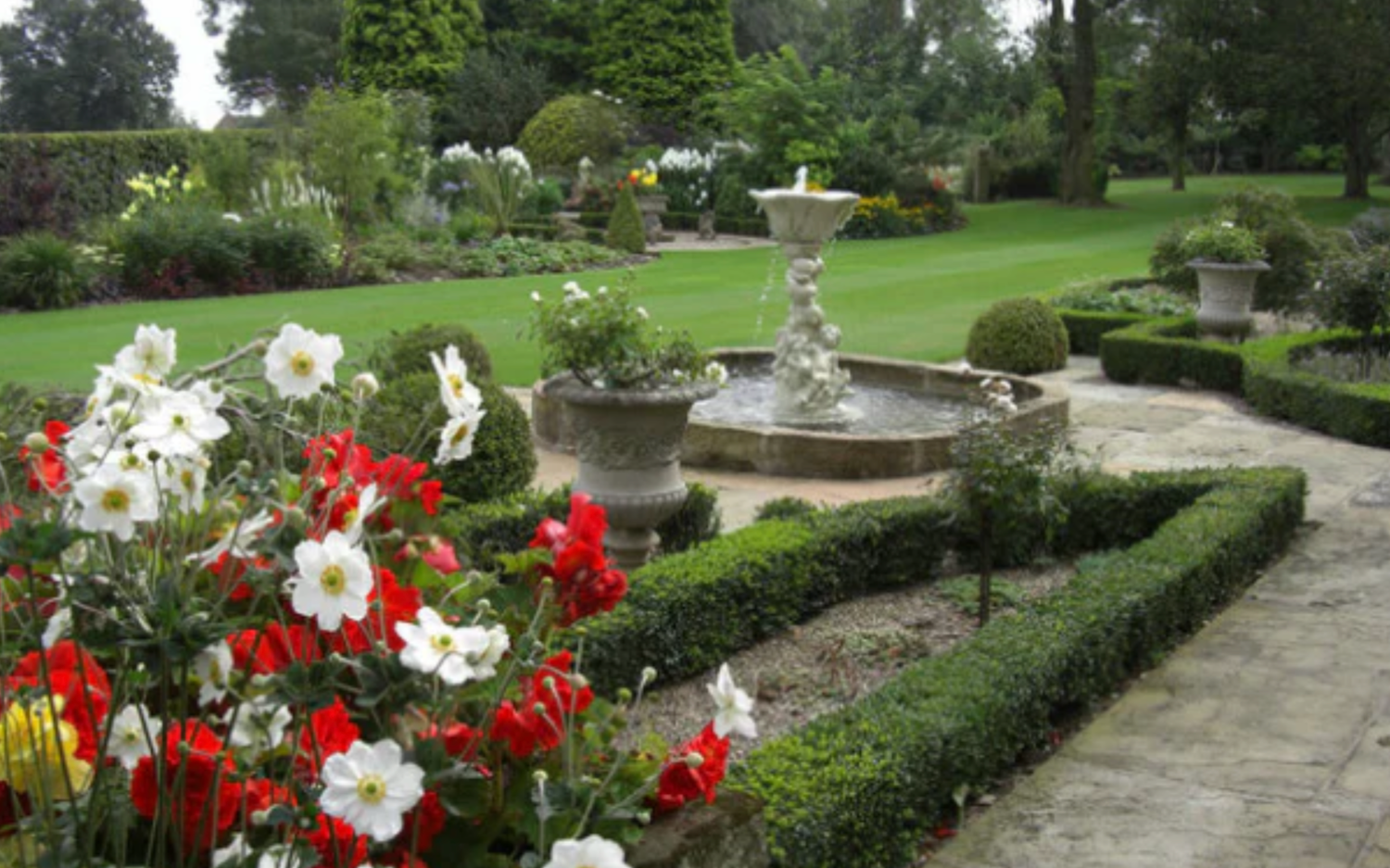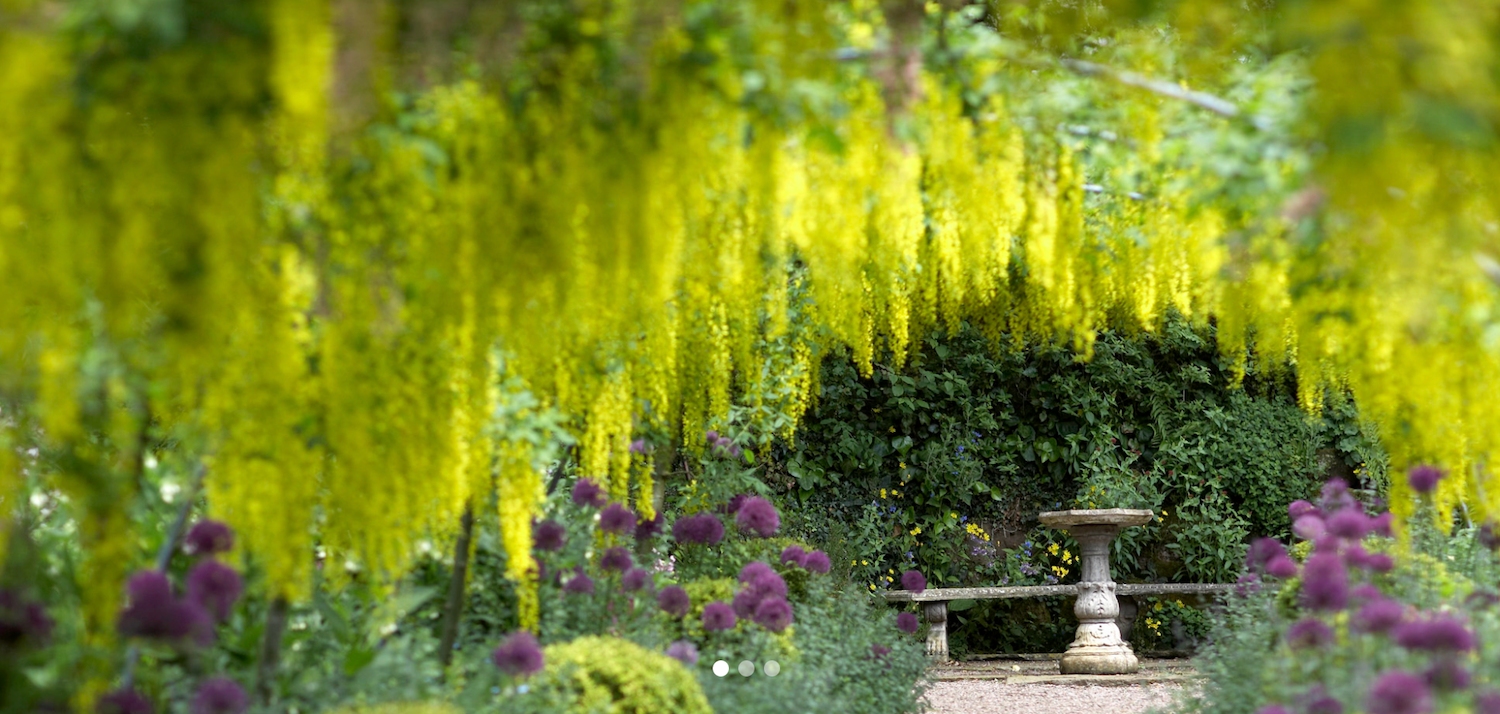 It is a fabulous five acre garden set in delightful Derbyshire countryside. Immaculate lawns set off a variety of 'rooms' in the garden including Roman, Italian, Cornish and of course English garden themes. There are many very mature trees and shrubs that combine beautifully with some more recent plantings. There are many rare plants to be found. The plants provide colour throughout the year and the garden changes on a weekly basis.