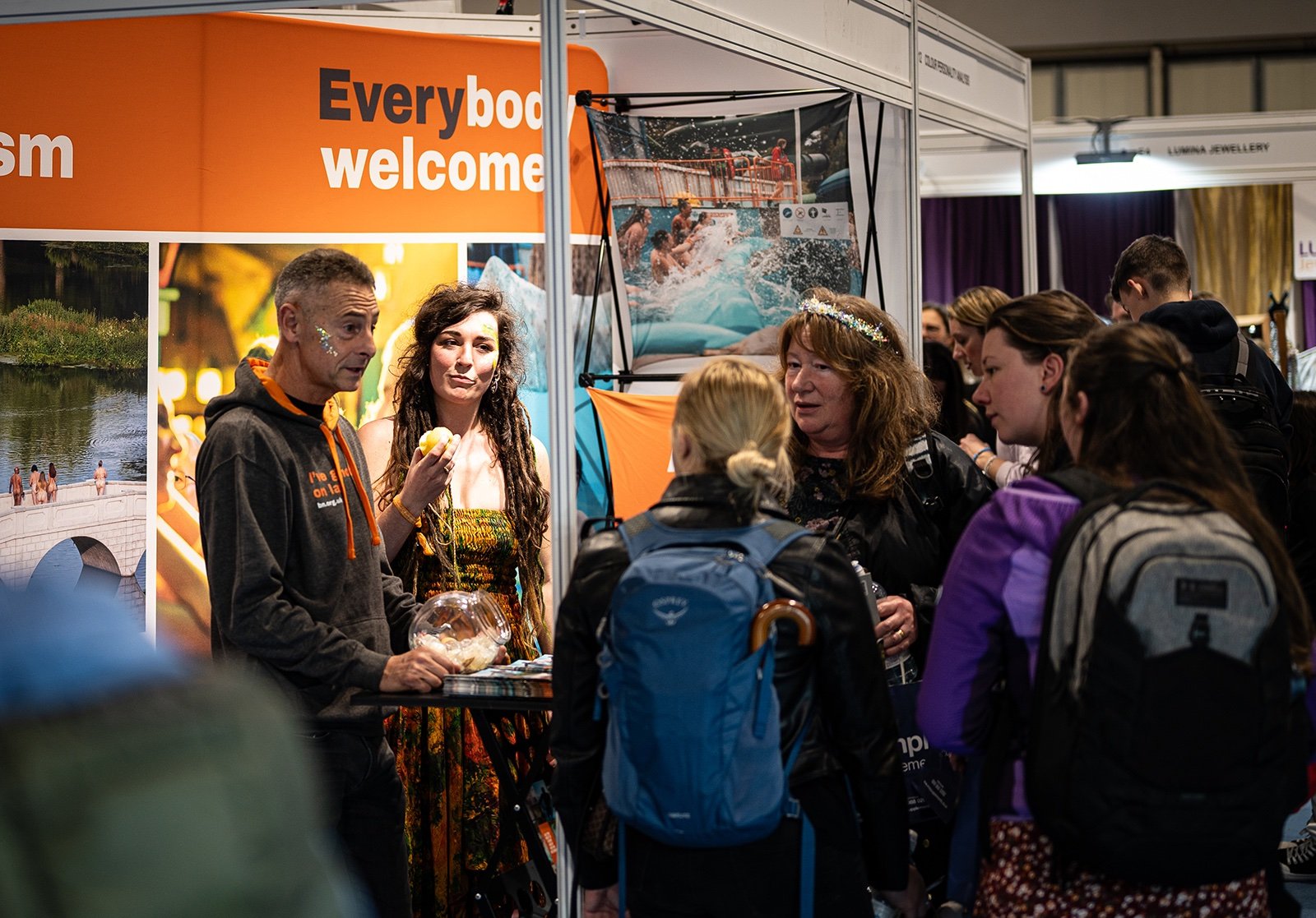 Last weekend, British Naturism returned to the NEC, Birmingham, to join the Mind Body Spirit Festival. The Mind Body Spirit Festival brings together inspirational, motivational speakers, musicians, artists, and vendors from around the globe. The event showcases spirituality and holistic approaches to wellbeing, including yoga, crystal healing, meditation, healthy living, card and rune reading, and sound and aromatherapy. Much of the focus is on living naturally and connecting to nature, making the connection to Naturism seamless.